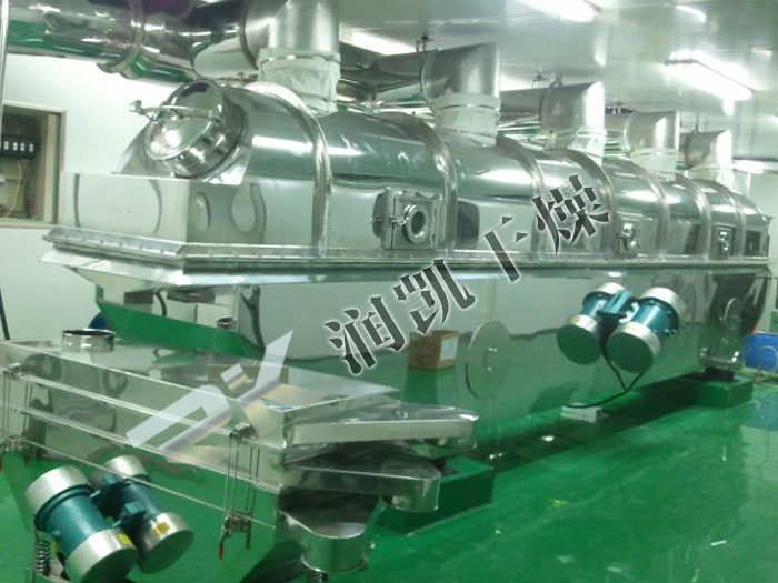 物料自進(jìn)料口進(jìn)入機(jī)內(nèi), 在振動(dòng)力作用下, 物料沿水平方向拋擲向前連續(xù)運(yùn)動(dòng),熱風(fēng)向上穿過流化床同濕料換熱后, 濕空氣經(jīng)旋風(fēng)分離器除塵后由排風(fēng)口排出, 干燥物料由排料口排出。